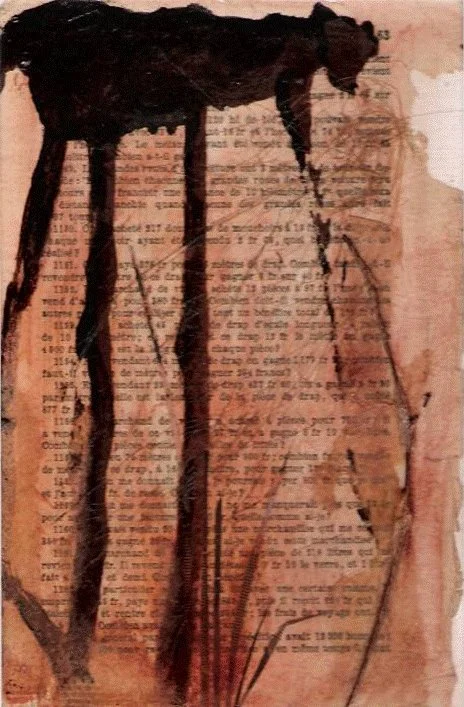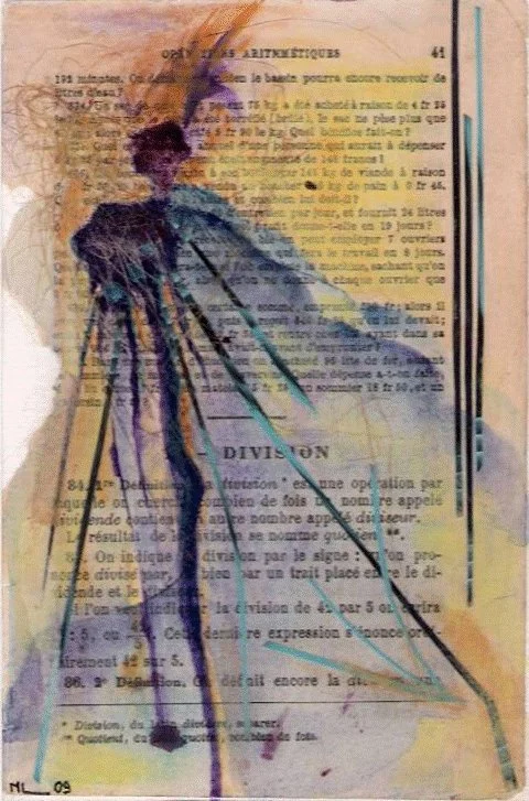 Les œuvres sont réalisées à partir d’anciens manuels scolaires utilisés comme supports. Sur ces pages déjà chargées de savoirs et de normes, j’interviens par collage et par superpositions de peinture (acrylique, aquarelle, encres d’imprimerie) laissant dialoguer le texte d’origine avec l’image transformée.