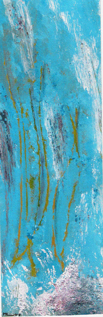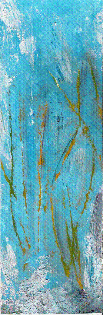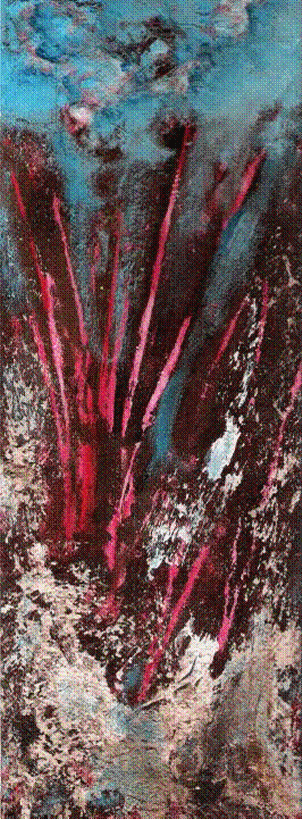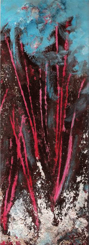Les toiles sont préparées en amont puis recouvertes d’une matière minérale épaisse mêlant pigments et pierre. Les éléments végétaux sont utilisés comme négatifs : appliqués puis retirés, ils révèlent leur empreinte dans le relief. La mise en couleur, principalement à l’acrylique, vient en accentuer la profondeur.