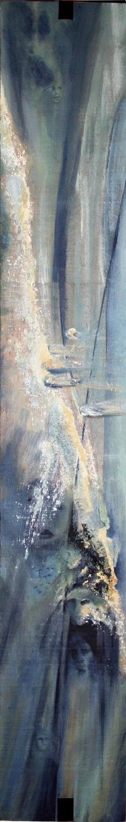 Les bois sont travaillés par frottage, ponçage ou noircissement. J’y associe acrylique, collages, encres d’impression et brou de noix, laissant dialoguer la peinture avec la texture brute du support.