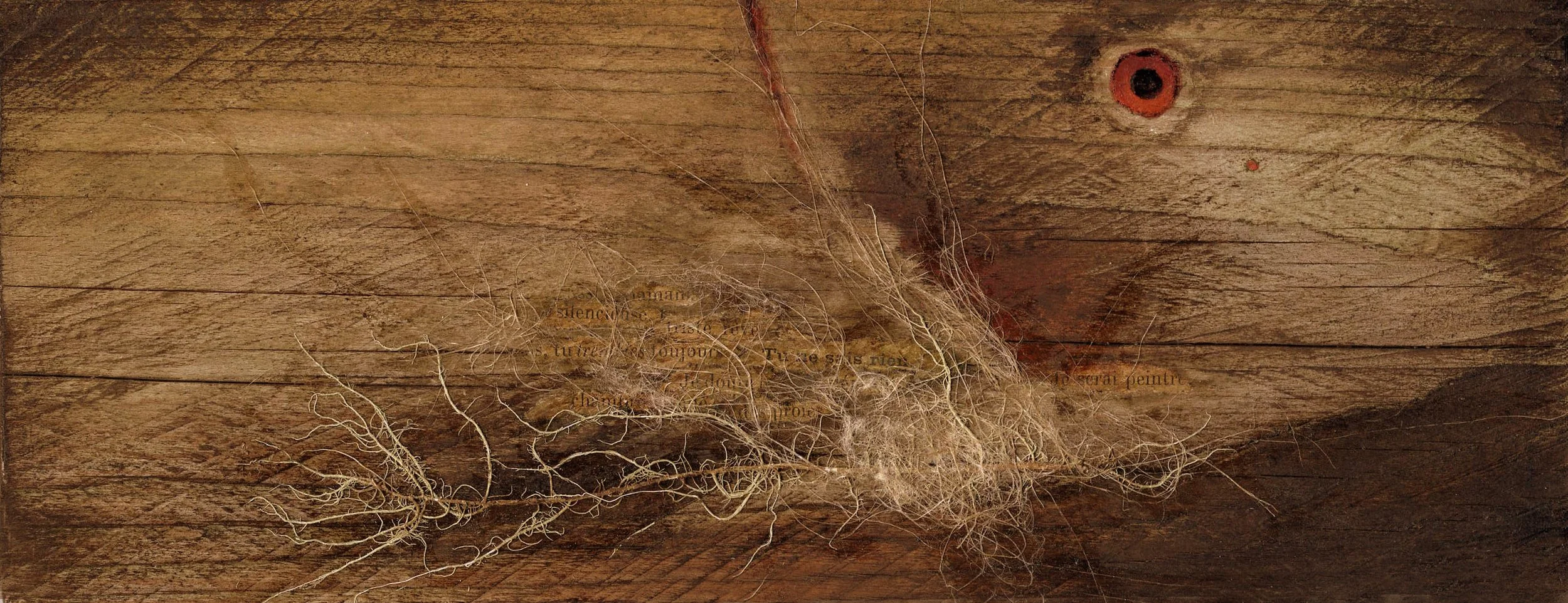 Planches récupérées, usées, fendues, porteuses d’histoires anonymes, elles deviennent le lieu d’apparitions : visages, animaux, présences à la frontière du visible.