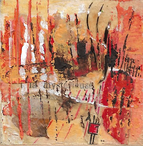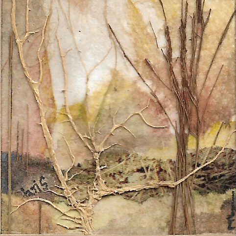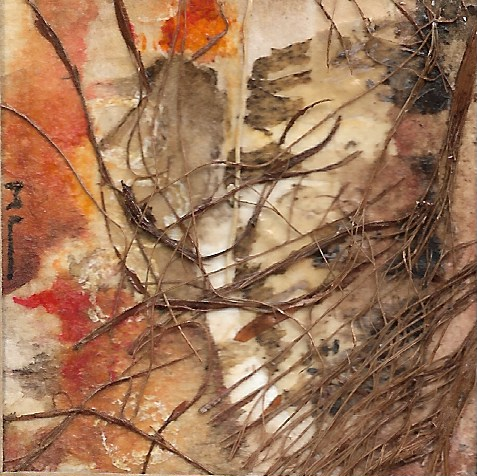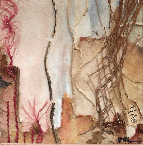 Sur papier, les œuvres naissent de fonds à l’aquarelle, à l’acrylique ou au pastel sec, enrichis de collages issus de livres, de matières végétales ou organiques et d’éléments textiles. Des couches successives de peinture, de pastel ou d’encre de Chine viennent ensuite prolonger le dialogue entre matière et écriture.